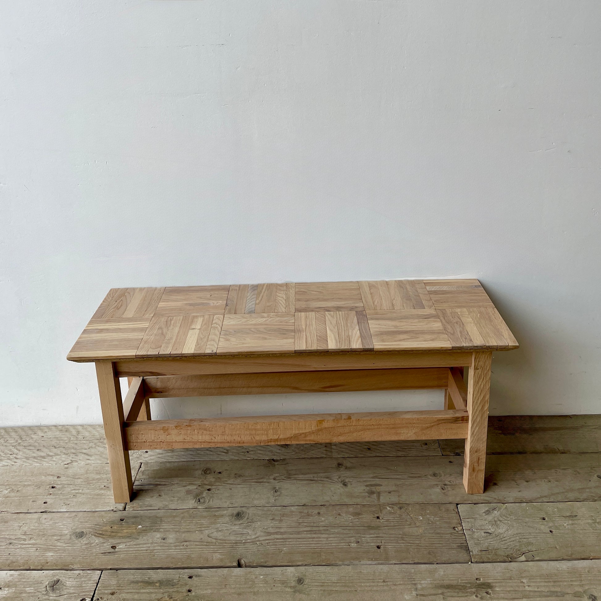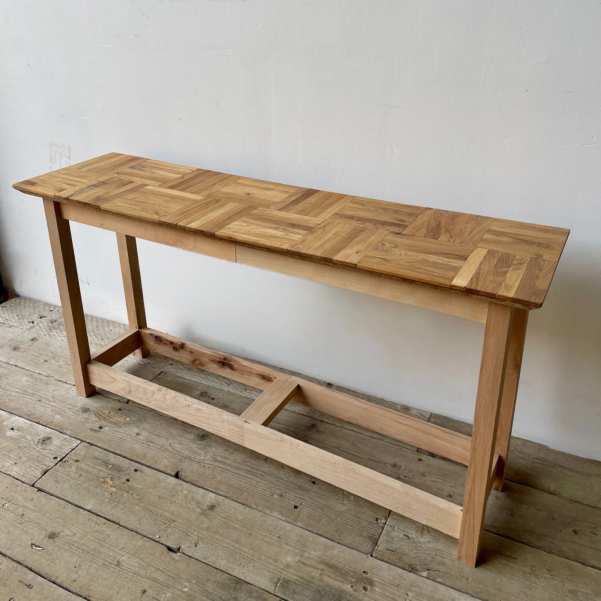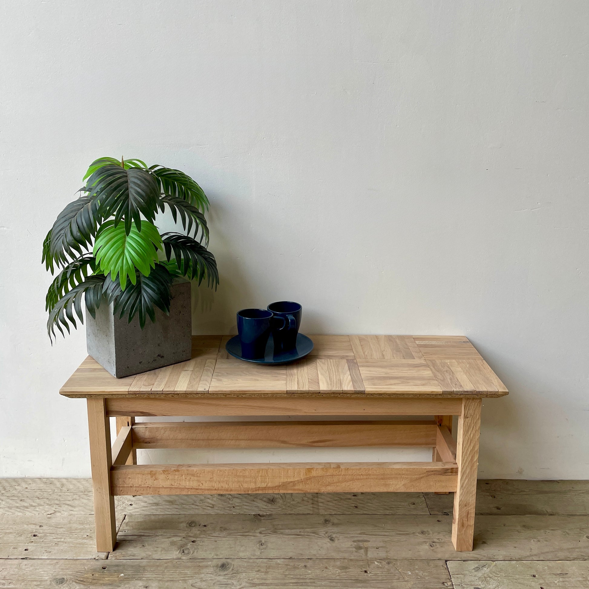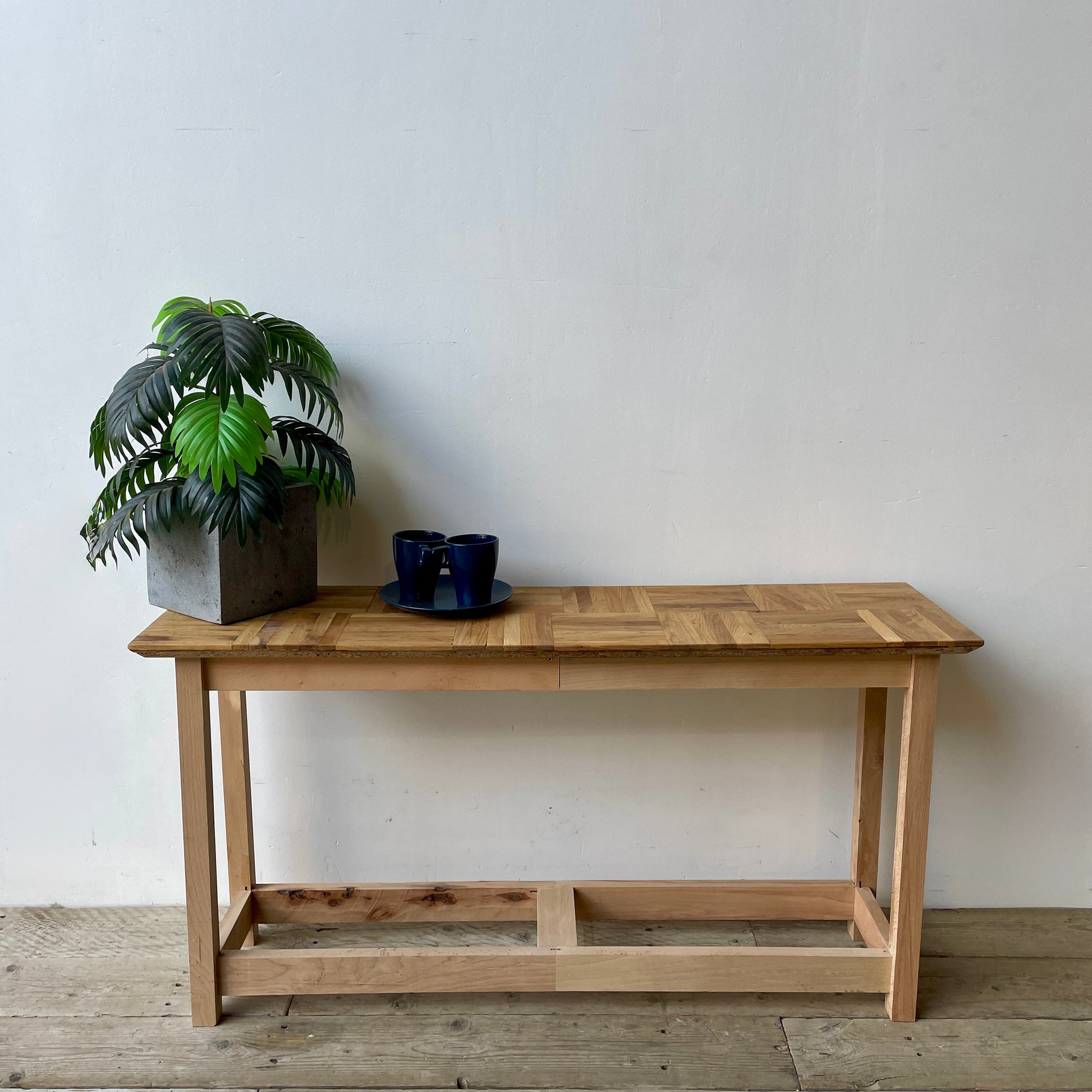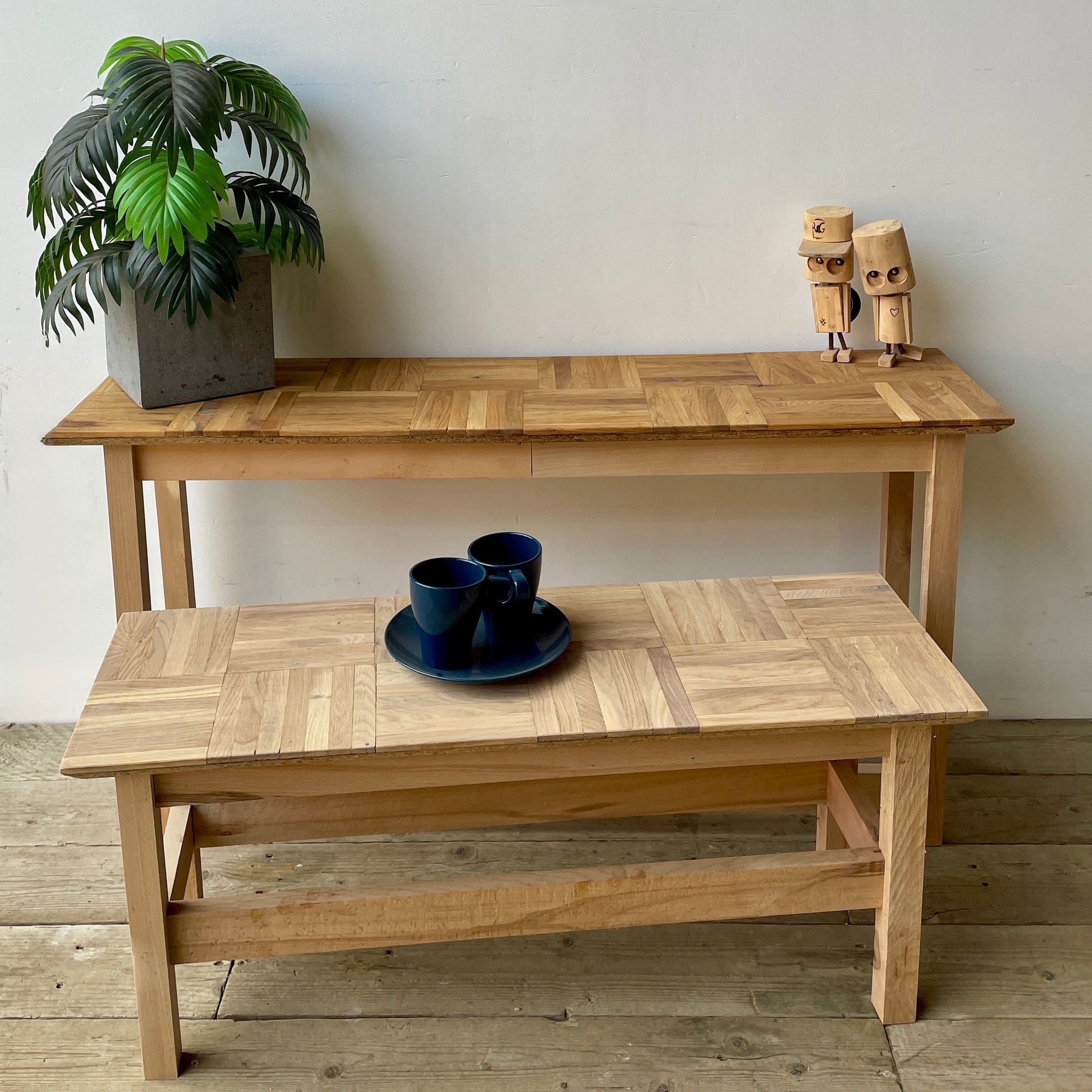 Bordene er lavet af genbrugt gulv med stel i genbrugstræ. Hvert bord er unikt og skabt med omtanke for materialernes historie og naturlige udtryk.