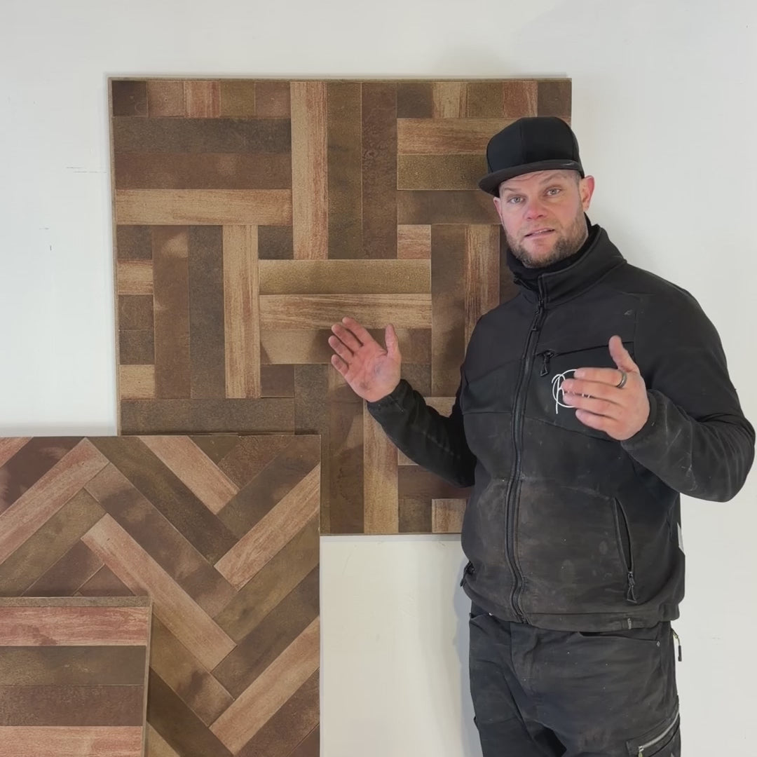 Denne beklædning fra Råt&Godt giver rummet et roligt, gennemført og karakterfuldt udtryk. Beklædningen kan sammensættes i forskellige mønstre f.eks. sildeben eller lige stave og tilpasses det enkelte rum. Udtrykket kan laves alt efter ønsker og kontekst i samarbejde med vores dygtige medarbejdere.